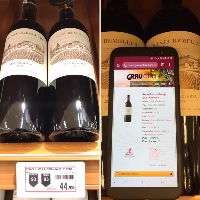 La etiqueta informa al consumidor del nombre del producto, precio, puntuación en el caso que sea un vino (según los criterios más importantes Robert Parker o Guía Peñín), si disponen de alguna oferta o la tipología del vino: si es natural, ecológico, biodinámico o vegano a través del logotipo correspondiente.