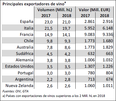 En cuanto a la facturación, Francia sigue siendo el primer exportador mundial en valor, con 9.300 millones de euros ingresados por sus exportaciones de vino en 2018. En general se constata un aumento global de las exportaciones, sobre todo en los principales países exportadores europeos: Francia (2,8 % más), Italia (3,3 % más), España (1,9 % más), Alemania (2,6 % más) y Portugal (3,1 % más). El único país que aumenta el valor de sus exportaciones, aparte de los europeos, es Australia (3,2 % más). Los descensos más acusados se registran en Estados Unidos (6,2 % menos), Argentina (5,5 % menos), Chile (5,2 % menos) y Nueva Zelanda (4,6 % menos).
