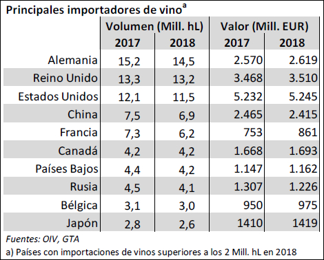 En 2018, Francia (620 millones de litros) registra una reducción del 14,6 % del volumen importado con respecto a 2017. La reducción de la disponibilidad, con precios iniciales en aumento, consigue hacer crecer el valor global de las importaciones francesas (aumento del 14,1 % con respecto a 2017). Se observa esta tendencia en todos los tipos de envase: el volumen de vinos embotellados se reduce en un 8 %, pero su valor aumenta en un 10 %; el volumen de vinos espumosos registra una reducción del 5 %, pero su valor aumenta en un 13 %; los vinos a granel experimentan una reducción del 13 % en volumen y un aumento del 19 % en valor.