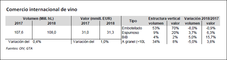 En 2018, el mercado internacional del vino, considerado como la suma de las exportaciones de todos los países, alcanzó un volumen de 10.800 millones de litros, lo que equivale a un ligero aumento (0,4 %) con respecto a 2017, y un valor de 31.300 Millones de euros, lo que equivale a un aumento del 1,2%, según los datos publicados por el OIV en su informe anual el pasado mes de abril.