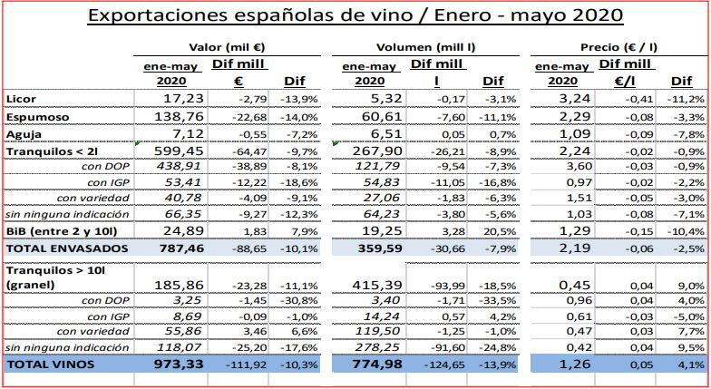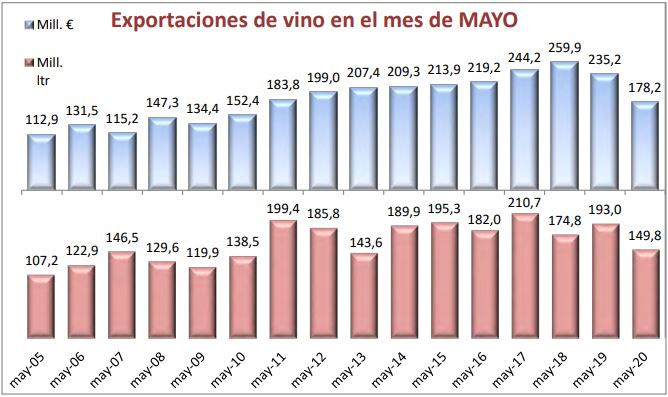 En el interanual a mayo de 2020, y en términos absolutos, España exportó 53 millones de litros menos, facturando casi 247 millones de euros menos, al caer el precio medio en 9 céntimos.