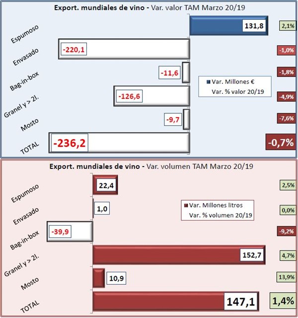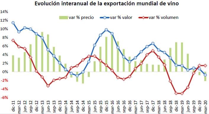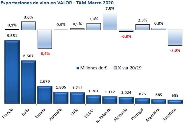 Los 11 principales proveedores mundiales (Italia, España, Francia, Chile, Australia, Alemania, Sudáfrica, Estados Unidos, Portugal, Nueva Zelanda y Argentina) representaron cerca del 90% de las exportaciones mundiales de vino en el interanual a marzo de 2020. De ellos, solo tres redujeron el valor de sus exportaciones: España (-245 millones de euros), Sudáfrica (-44,6 millones) y Alemania (-8 millones), mientras que fueron cuatro los que cayeron en volumen: Sudáfrica (-93 millones de litros), Australia (-83 millones), Francia (-15 millones) y Estados Unidos (-9,6 millones).