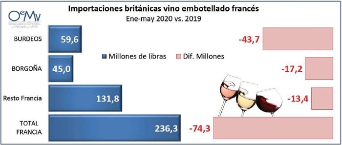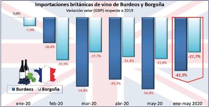 La pésima evolución de Burdeos y Borgoña explica que, en estos 5 primeros meses y en plena incertidumbre comercial ante diversas amenazas que afectan al sector como son el Brexit y la crisis del coronavirus, Reino Unido haya redujo sus importaciones de vino embotellado francés nada menos que un 17% en volumen y un 24% en valor.