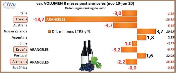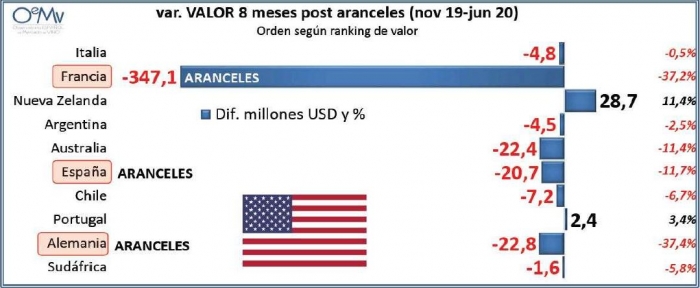 Francia, proveedor con gran valor añadido, ha sido claramente el país más afectado por la subida de aranceles. Estados Unidos redujo sus importaciones de vino francés embotellado (no espumoso) un 37% en valor durante los 8 primeros meses desde la entrada en vigor de la medida, dejando de gastar 347 millones de dólares. También fue el país que más cayó en volumen, perdiendo más de 18 millones de litros (19,3%), pese a que su precio medio ha venido cayendo sensiblemente en este período.