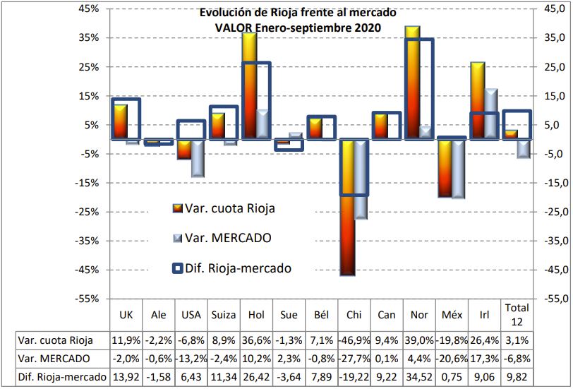 La excelente evolución registrada por las exportaciones de vino con DOCa Rioja, en los nueve primeros meses de 2020, con crecimientos del 2% en valor y del 10% en volumen, hasta situarse en los 347,4 millones € y rozar los 78 millones de litros, es reflejo de su buena marcha en algunos de los principales mercados, como son Reino Unido, Holanda, Bélgica, Canadá, Noruega o Irlanda, lo que les permite ganar cuota de mercado.