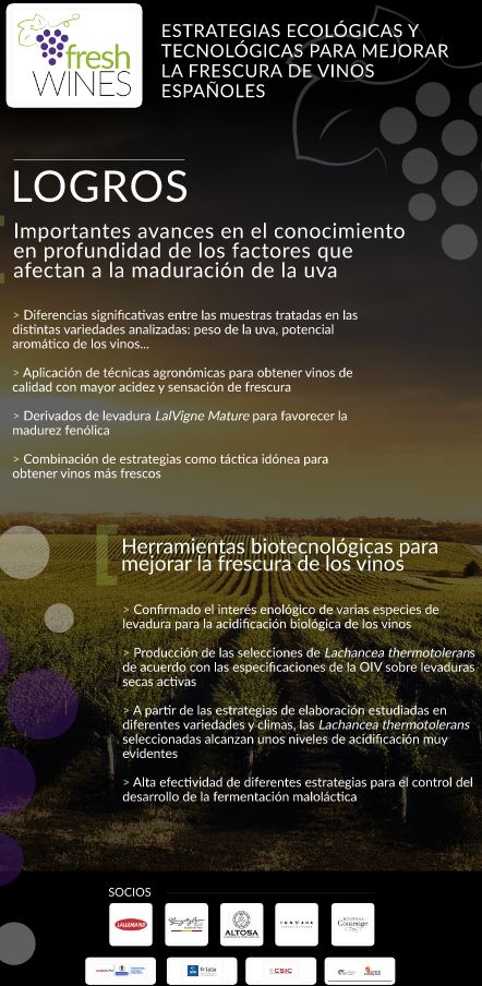 Freshwines, el proyecto de I+D para mejorar la frescura de los vinos españoles, ya ha concluido tras tres años de trabajos para desarrollar nuevos conocimientos y tecnologías con este fin. Entre los logros obtenidos, destacan los importantes avances en el conocimiento en profundidad de los factores que afectan a la maduración de las uvas, así como la obtención exitosa de herramientas biotecnológicas para mejorar significativamente el frescor de los vinos.