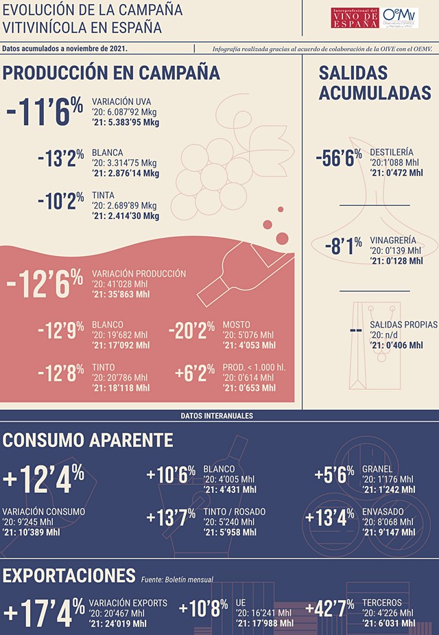 El informe, elaborado por el Observatorio Español del Mercado del Vino (OeMV) para OIVE, se basa en los datos que mensualmente declaran todos los operadores al sistema INFOVI. En esta ocasión, con datos noviembre 2021, se recogen también las declaraciones de los productores de menos de 1.000 hl, lo que da mayor precisión al análisis.