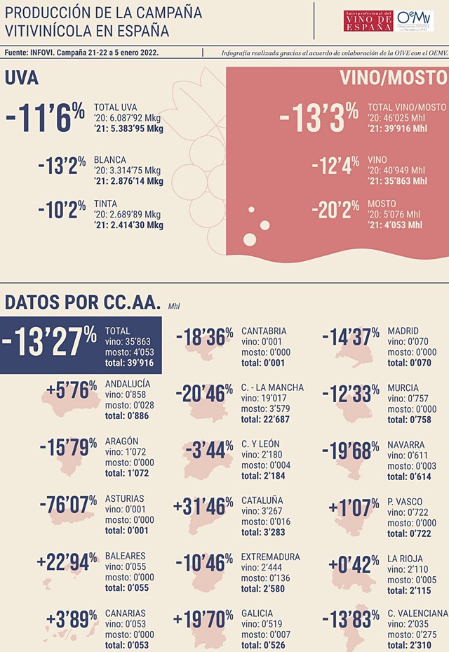 El descenso es más pronunciado en la producción de mosto, que disminuye un 21,6%, para situarse en 4 millones de hectolitros. Mientras tanto, el vino supera los 35,8 millones de hectolitros, lo que se traduce en un 12,6% menos que en noviembre de 2020.