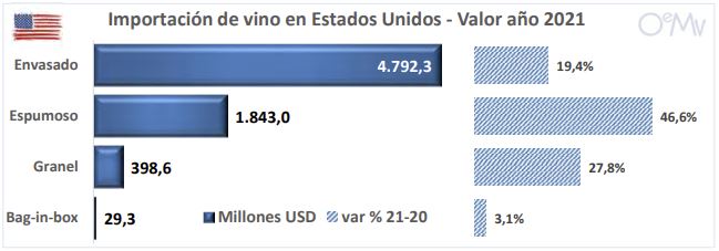 Estados Unidos gastó 1.450 millones de dólares más en vino respecto a 2020, año aciago para el valor de las importaciones estadounidenses, el cual cayó un 9,3% (-576 millones USD), por dos motivos: uno, las restricciones comerciales derivadas de la pandemia de COVID-19; y dos, la entrada en vigor, en octubre de 2019, de la subida de aranceles adoptada por la Administración Trump contra algunos vinos embotellados europeos, medida abolida por la nueva Administración Biden-Harris. El volumen importado sí se mantuvo estable en 2020, con precios muy a la baja.