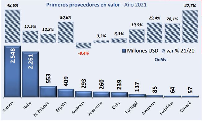 Gana cuota como tercer proveedor en volumen, cerca de los 207 millones de Canadá (+26%), segundo, aunque lejos de los 385,6 millones de Italia (+12,5%), que exportó más vino que nunca y casi duplicó las ventas francesas.