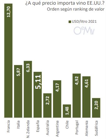 En cuanto a los precios medios, el vino español se encareció un 4,5% en 2021, hasta los 5,11 USD/litro, el más elevado desde 2014 y superior al de países como Australia, Argentina, Chile, Portugal, Alemania o Sudáfrica. Nueva Zelanda y Australia también subieron de precio, con ligera bajada para el vino argentino y chileno.