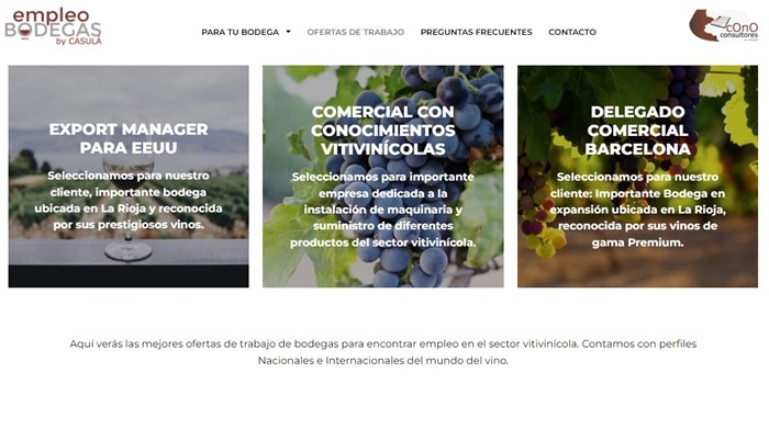 Con un equipo de consultores técnicos especializados en el sector del vino desde hace más de 35 años, el lanzamiento del portal EmpleoBodegas.com supone, para las bodegas y empresas vitivinícolas, una herramienta de gran valor que les ayudará a encontrar, de forma ágil y rápida, candidatos del sector capaces de cubrir sus vacantes, con el respaldo técnico adecuado detrás.