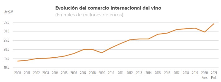 Con un volumen de 11.160 millones de litros, el mayor volumen exportado jamás registrado en la historia, las exportaciones mundiales de vino en 2021 aumentaron un 4% respecto a 2020, y se impulsaron aún más en términos de valor, con 34.300 millones de euros, registrando un incremento anual del 16%.