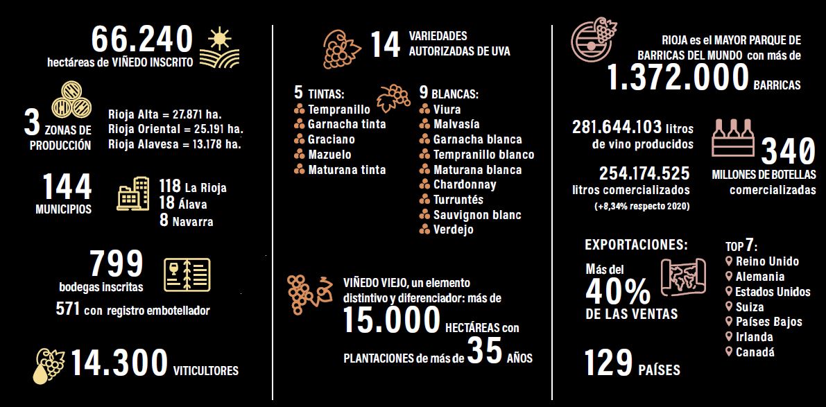 Rioja, la Denominación de Origen más antigua de España desde 1925, y la primera en recibir la certificación de Calificada en 1991, se posiciona como una de las Denominaciones de Origen del mundo que mayores garantías ofrece respecto a la calidad y autenticidad de sus vinos, gracias a la exigente normativa de autocontrol puesta en marcha por su Consejo Regulador. Esto unido a su carácter pionero, su apuesta por la innovación y la sostenibilidad ha sido determinante para alcanzar la posición de liderazgo que los vinos de Rioja ocupan en el mercado, tanto a nivel nacional como internacional. Rioja cuenta con casi el 40% del valor del vino con Denominación de Origen en España y está presente en 129 países.