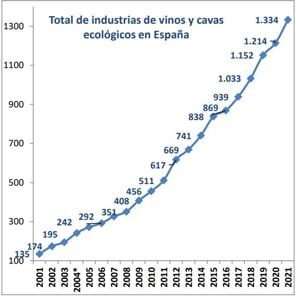En lo que se refiere al viñedo ecológico, destaca dentro de los cultivos permanentes con 142.176,9 hectáreas (el 15,1% de la superficie de viñedo total), obteniendo 492.397 toneladas de uvas de vinificación en 2021. Con respecto a 2020, aumentó la superficie un 8,4% (+10.994 ha).