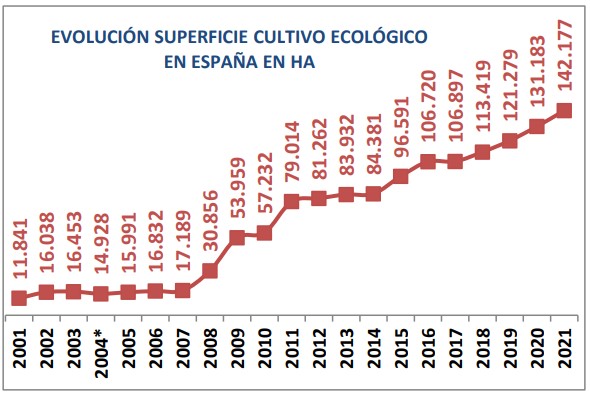 Según los datos del MAPA, en 2021 España suma 2.635.441 hectáreas de superficie de producción ecológica, que suponen un incremento del 8,1% respecto a la superficie de 2021. Fue en 2016, cuando se superaron por primera vez los dos millones de hectáreas.