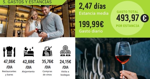 Uno de los datos aportados y que revela esa tendencia positiva y, por ende, la rápida recuperación del sector, es el relacionado con el gasto medio, que ha experimentado un crecimiento nunca antes registrado y se sitúa en 199,99 euros por persona y día (superior al gasto del turista general extranjero y del nacional, según los datos aportados por el INE-EGATUR y FAMILITUR). Este dato, unido a otro de los parámetros analizados, como el tiempo que el enoturista pasa en el destino, permite conocer cuál es el gasto medio total durante su estancia. Los días de media en destino también han experimentado una ligera subida y se sitúan en 2,47. Poniendo en relación estas dos variables, la cifra del gasto medio total en estancia alcanza los 493,97 euros.