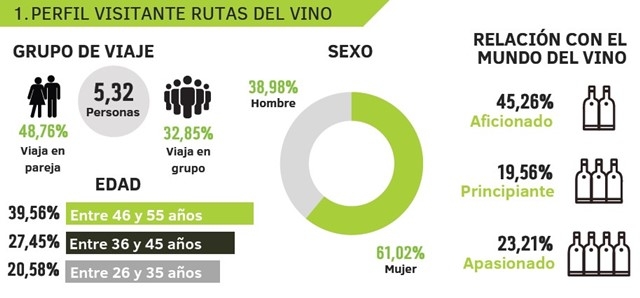 El dato anterior guarda relación con el tipo de grupo predominante: los viajes en pareja siguen siendo los predominantes (48,76%), seguidos de los viajes en grupo de amigos (32,85%). Las familias con niños representan casi el doble que las familias sin niños, de lo que el informe deduce que sería razonable considerar el enoturismo como una alternativa vacacional familiar. En general, el tamaño medio del grupo se sitúa en 5,32 personas, habiendo aumentado en casi dos puntos respecto al informe precedente.