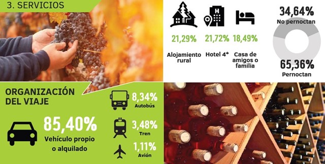 Los datos relacionados con la estancia en destino, con las pernoctaciones, continúan mostrando la tendencia a alargar el número de días que el enoturista pasa en el territorio. Si bien hay un ligero descenso en el porcentaje de visitantes que pernoctan, el número total sigue siendo bastante superior a los excursionistas. Las cifras del nuevo informe indican que el 65,36% de los visitantes de las Rutas del Vino de España pernoctan en destino, frente al 34,64% de visitantes excursionistas. A pesar del pequeño porcentaje en que han descendido las pernoctaciones y la cifra elevada que supone el excursionismo, son datos bastante positivos. Al mismo tiempo, el nuevo informe presenta un cambio en cuanto al tipo de alojamiento elegido por los enoturistas: si en el anterior estudio el alojamiento rural superó por primera vez a los hoteles (reflejo de la manera de viajar provocada por la pandemia), en este, los hoteles de cuatro estrellas vuelven a situarse en cabeza a la hora de elegir dónde alojarse. Esta opción, dominante en casi todos los informes anteriores, alcanza el 21,72%, seguida muy de cerca por el alojamiento rural (21,29%) y las casas de amigos o familiares (18,49%).