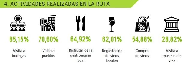 El informe también recoge datos sobre las distintas actividades realizadas en el destino. La visita a bodegas continúa siendo la actividad más solicitada: un 85,15% de enoturistas manifiesta haber realizado una visita, al menos, a alguna bodega. La media de bodegas visitadas se sitúa en 2,06, un porcentaje algo superior al anterior. Entre las actividades que le siguen están la visita a pueblos (70,60%), disfrutar de la gastronomía local (64,92%), degustación de vinos locales (62,01%) y compra de vinos (54,88%). Todas ellas, especialmente las tres últimas, han experimentado un gran crecimiento con respecto al periodo anterior. Las actividades en la naturaleza y las culturales, así como las visitas a museos del vino ocupan también buena parte del ocio de los enoturistas en las Rutas del Vino de España.