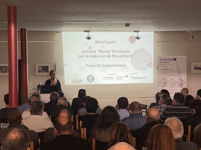 La presentación de los resultados obtenidos por Familia Torres y Jean Leon en el marco de COPPEREPLACE se ha realizado durante una jornada técnica titulada 'Nuevas técnicas para la reducción de fitosanitarios en el viñedo', en la que la Universidad Politécnica de Catalunya, miembro del consorcio de COPPEREPLACE, también ha expuesto sus resultados. Han intervenido en la presentación Emilio Gil, director de la unidad de mecanización agraria de la UPC, y la investigadora Elena Sánchez, quien ha detallado los resultados de los tratamientos de aplicación variable y de las microcápsulas de cobre. La jornada ha contado, además, con la participación de Joan Reyes, responsable de la sección de agricultura y sanidad vegetal de los servicios territoriales del Departament d'Acció Climática, Alimentació i Agenda Rural (Generalitat de Catalunya) en Barcelona, quien ha expuesto la situación legal del cobre a nivel europeo.