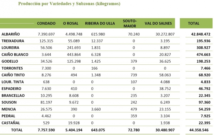 La distribución de la producción por subzonas sigue liderada por el Val do Salnés, que aporta el 68,7% del total. El Condado do Tea y O Rosal le siguen con un 17,7% y un 12,2% respectivamente.