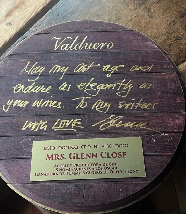 La dedicatoria de Glenn Close en su barrica como miembro de honor de La Tenada de Valduero refleja la conexión emocional que estableció con la bodega y sus fundadoras. Sus palabras, "Que mi arte envejezca y permanezca tan elegante como vuestros vinos", simbolizan el paralelismo que encuentra entre su trayectoria artística y la evolución del vino a lo largo del tiempo.