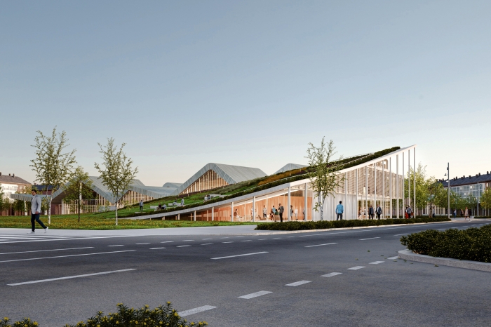 En Vitoria-Gasteiz, el edificio respeta el paisaje y el contexto urbano, levantándose como un manto vegetal que se integra con los edificios colindantes, mejorando los espacios circundantes y reduciendo el impacto visual. La fachada se eleva del suelo y se abre hacia las calles Donostia y Boulevard de Euskal Herria, ofreciendo dos entradas diferentes: una formal al vestíbulo y otra informal conectada directamente con el exterior. El edificio agrupa espacios conectados visual y físicamente, fomentando la transparencia y la interrelación entre el público.