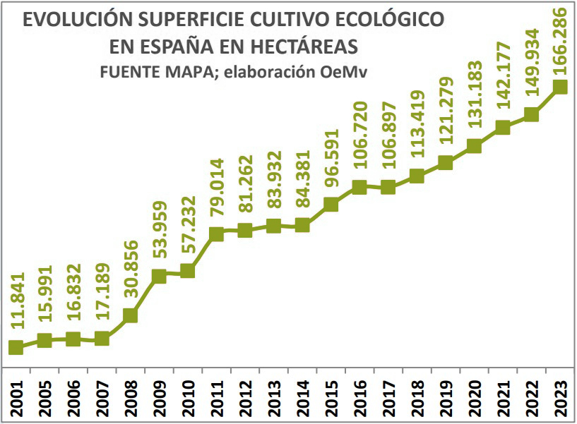 En 2023, España destinó 166.286 hectáreas de viñedo a la producción ecológica, lo que representa un aumento del 10,9% en comparación con el año anterior. Esta cifra supone el 18% de la superficie total de viñedo en el país. Los datos provienen del informe publicado por el Ministerio de Agricultura, Pesca y Alimentación (MAPA) dentro de las Estadísticas de Producción Ecológica 2023, disponibles a través del Observatorio Español del Mercado del Vino (OeMv). En términos generales, la superficie de producción ecológica en España ascendió a 2.991.881 hectáreas, registrando un incremento del 11,8% respecto al año 2022. Cabe señalar que en 2016 España había superado por primera vez la barrera de los dos millones de hectáreas dedicadas a la producción ecológica.