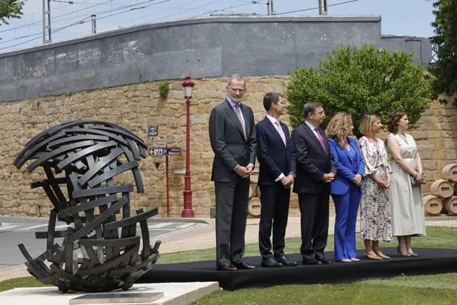 La jornada comenzó en Haro, donde el Rey visitó el Barrio de la Estación, acompañado por el presidente del Gobierno de La Rioja, Gonzalo Capellán, la alcaldesa Guadalupe Fernández y miembros del Consejo Regulador. Este enclave, considerado la cuna del desarrollo de Rioja como Denominación, fue el centro de las primeras exportaciones de vino y conserva algunas de las bodegas más antiguas. Allí se inauguró el nuevo "Espacio Centenario de Rioja", que desde hoy da nombre a la zona y que incluye una escultura del artista local José Antonio Olarte. La obra representa los cien ciclos de cosecha a través de cien piezas de hierro, integradas con formas inspiradas en la naturaleza y los elementos del mundo del vino.