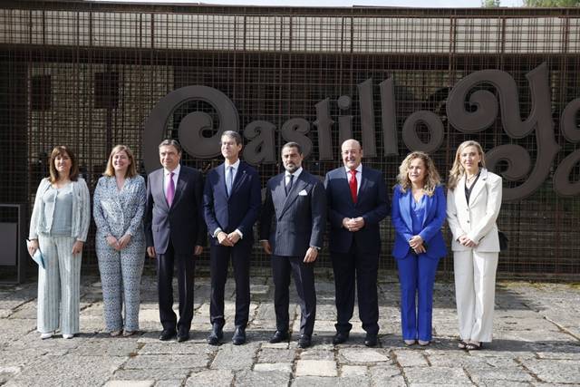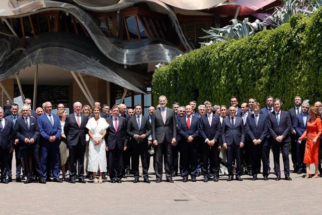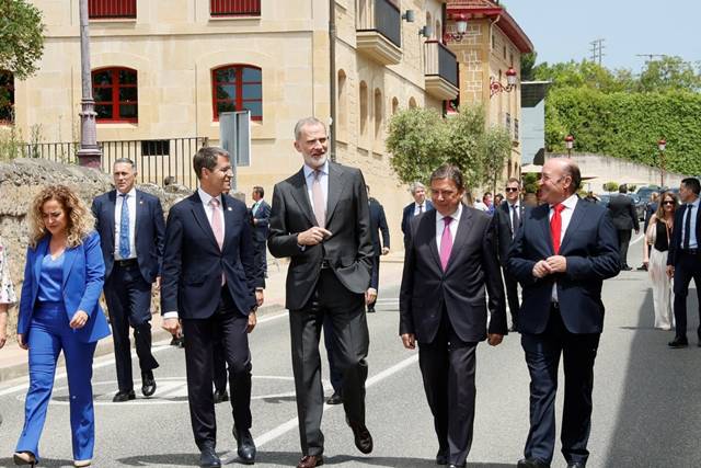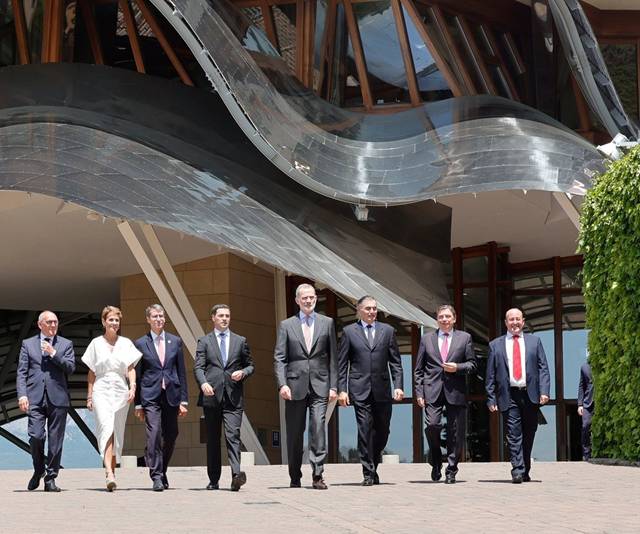 Posteriormente, la celebración continuó en las Bodegas Marqués de Riscal, en Elciego. Este fue el lugar elegido para el acto institucional principal, al que acudieron también el ministro de Agricultura, Luis Planas, y los presidentes de las tres comunidades autónomas que comparten territorio con la Denominación: La Rioja, el País Vasco y Navarra. Gonzalo Capellán, Imanol Pradales y María Chivite participaron junto al monarca en la recepción oficial y acompañaron a la comitiva durante el recorrido por las instalaciones.