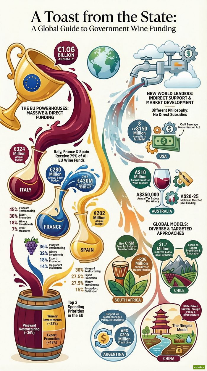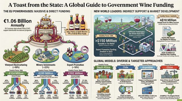 Across all these countries, public financial support remains critical as governments seek to stabilize markets after recent surpluses or trade disruptions while investing in long-term competitiveness through modernization and global marketing efforts. While models differ—from Europe’s direct subsidies to New World countries’ focus on market development—the trend in late 2025 is toward maintaining or increasing public backing amid ongoing economic pressures on producers worldwide. Forecasts into 2026 suggest continued stability or incremental growth in most national budgets dedicated to supporting their respective wine industries.