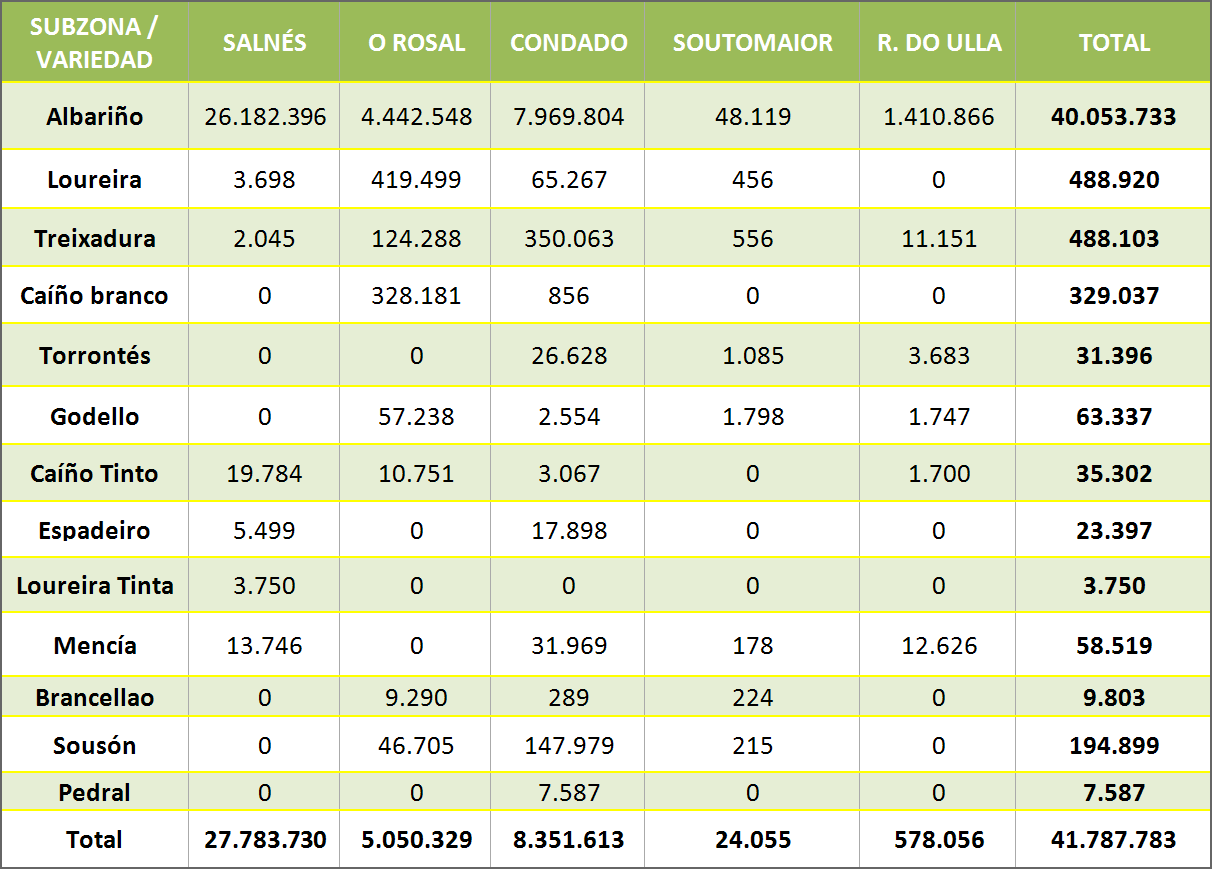 Por subzonas, la mayor cantidad de uva vinificada se ha obtenido, un año más, en el Salnés, con 27.783.730kilos, seguido por Condado, con 8.351.613 kilos; O Rosal, con 5.050.329kilos; Ribeira do Ulla, con 578.056 kilos y Soutomaior, con 24.055 kilos.