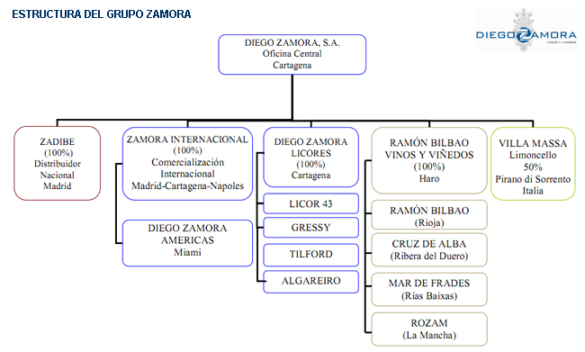 De ese modo, la sociedad principal Diego Zamora queda como gestora de acciones y servicios generales del grupo (separada de la actividad industrial); y segrega su actividad en dos subholding, el liderado por la nueva DZ Licores, que se convierte en cabecera de la división licorera del grupo y el de la división vitivinícola, liderado por Ramón Bilbao Vinos y Viñedos.