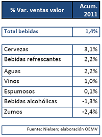 La evolución del conjunto de bebidas es positiva aunque algo floja, con crecimiento global del 1,4%, destacando el aumento de las cervezas (+3,1%), de las bebidas refrescantes (+2,2%) y de las aguas (+2,2%).