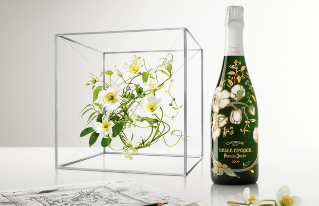 Desafiando los límites estéticos, Makoto Azuma creó un trabajo artístico de combinación única, formado por un solo arabesco botánico delicado punteado con anémonas japonesas blancas. Estas recuerdan el diseño original de 1902, lo que viene reforzado con un motivo hecho a mano de flores doradas en la botella de Belle Epoque 2004, cuidadosamente seleccionada por el Maestro Bodeguero Hervé Deschamps.