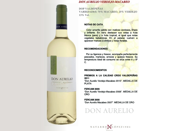 El vino "Don Aurelio Verdejo-Macabeo 2011" de Bodegas Navarro López, de Valdepeñas (Ciudad Real) ha sido distinguido con la Medalla de Oro en la categoría de vino blanco en el 42 Concurso Regional de Calidad de Vinos de la Feria Regional del Campo y de Muestras (FERCAM).