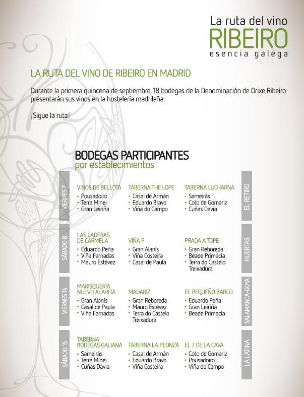 Este viernes, 7 de septiembre, arranca en Madrid la “Ruta do Ribeiro. Esencia galega” una actividad en la que participan 18 bodegas de la Denominación de Origen y que permitirá al consumidor madrileño disfrutar de una nutrida selección de los vinos de la D.O. en 12 establecimientos de la ciudad.