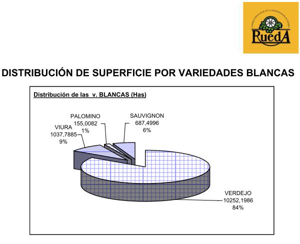 En la campaña de vendimia 2012 la superficie registrada asciende a 12.826 hectáreas de la cuales el 95% corresponden a variedades de uva blanca con 12.135 hectáreas. La variedad principal y autóctona de la D.O. Rueda, la Verdejo, es claramente la mayoritaria y alcanza las 10.255 hectáreas, de las cuales el 92% se encuentran conducidas en espaldera y susceptibles de ser vendimiadas con máquinas. Esta campaña la superficie de viñedo se ha incrementado en 242 hectáreas, alcanzando un nuevo máximo histórico.