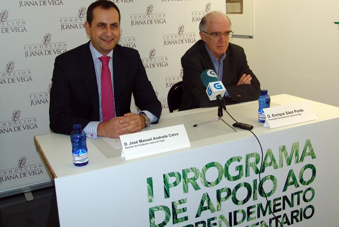 El presidente de la Fundación Juana de Vega, Enrique Sáez, y el director de esta entidad, José Manuel Andrade, presentaron hoy a los medios de comunicación el primer Programa de Apoyo al Emprendimiento Agroalimentario. Se trata de una iniciativa pionera en Galicia y desarrollada por la Fundación Juana de Vega que tiene como objetivo contribuir a la mejora del tejido empresarial y el progreso económico y social de en medio rural gallego, a través del fomento de la iniciativa emprendedora en el sector agroalimentario.