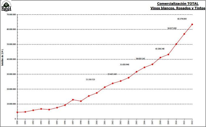 Un año más se consolida la tendencia de crecimiento de la D.O. Rueda al haber entregado un total de 63.376.004 contraetiquetas a lo largo del año 2012, lo que supone un crecimiento del 11,33% respecto al año anterior, es decir 6.4487.175 botellas más. El crecimiento se produce tanto en mercado exterior como en el mercado nacional.