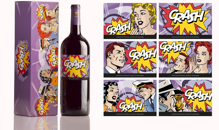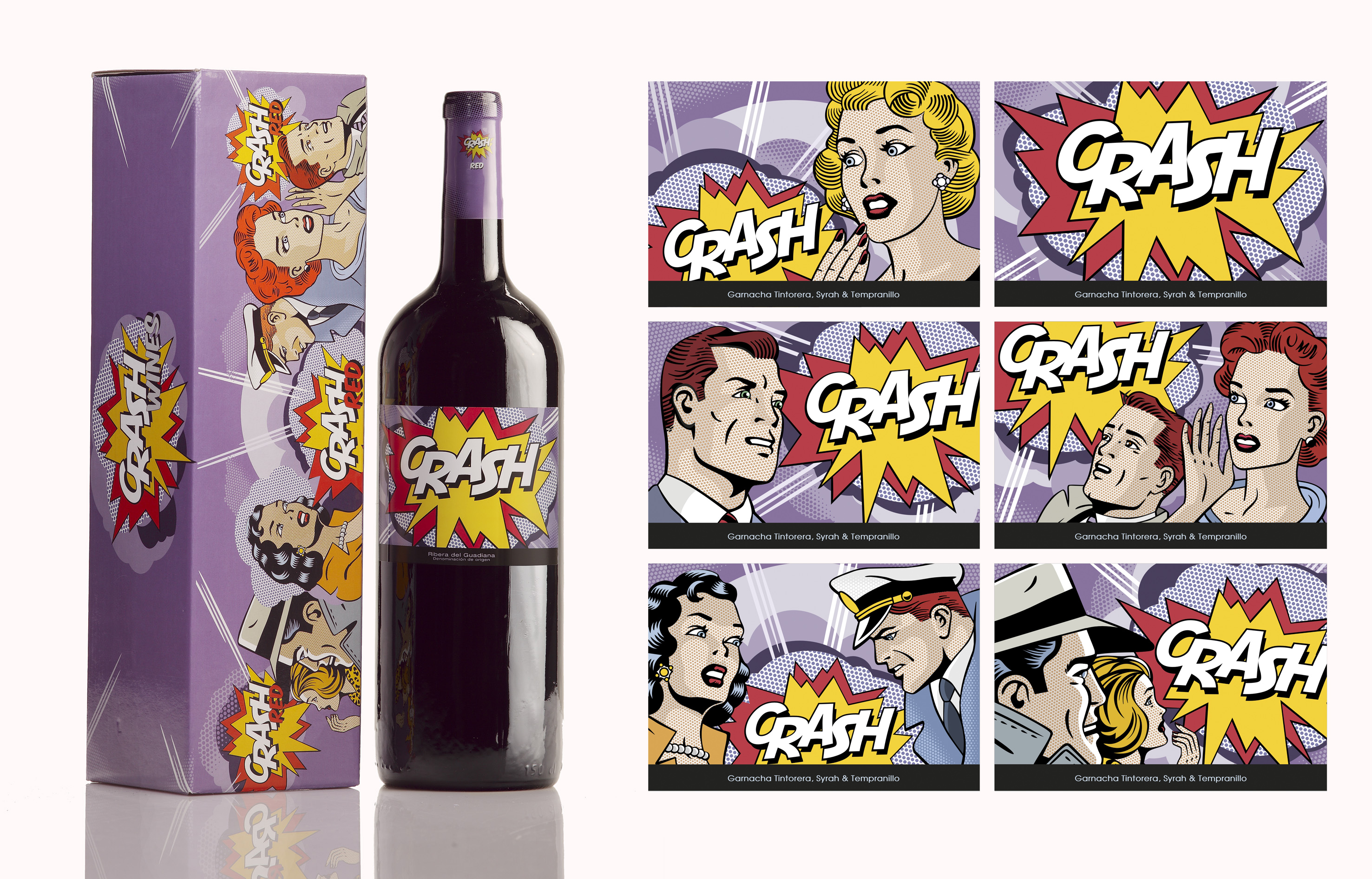 Crash se presenta con seis etiquetas diferentes todas ellas inspiradas en la corriente artística del Pop Art, más concretamente en Roy Lichtenstein. Ilustraciones únicas que han sido específicamente diseñadas para estos vinos por el ilustrador Alvaro Ortega y la agencia No Line.