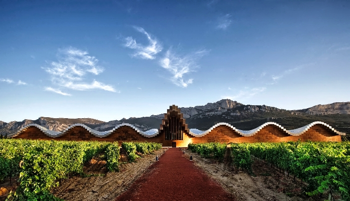 Es una de las construcciones más vanguardistas de la zona y destaca por la ondulación de sus tejados de aluminio con la sierra de Cantabria como fondo, en medio de un paisaje de viñas.