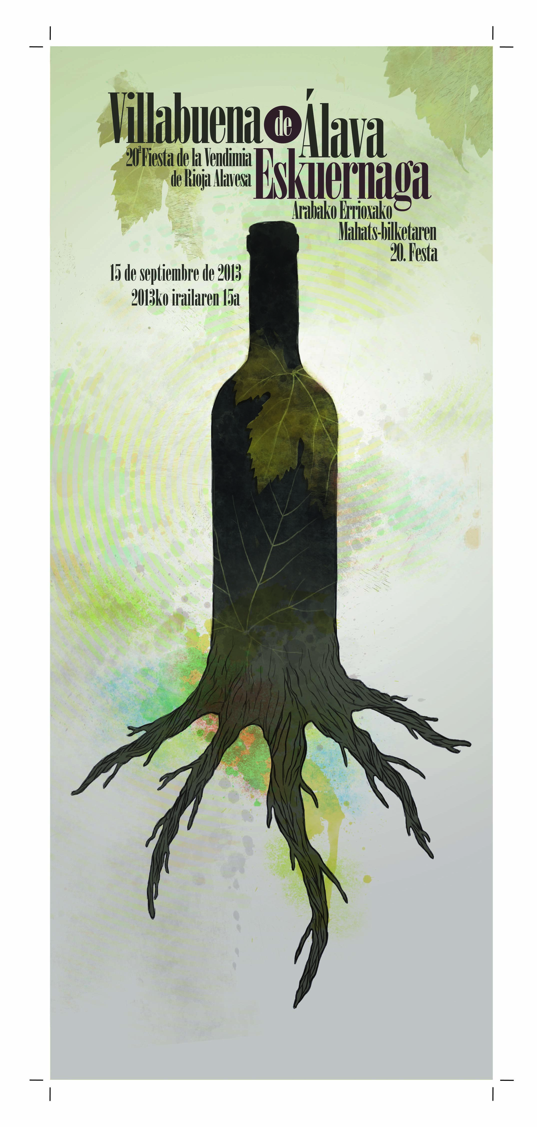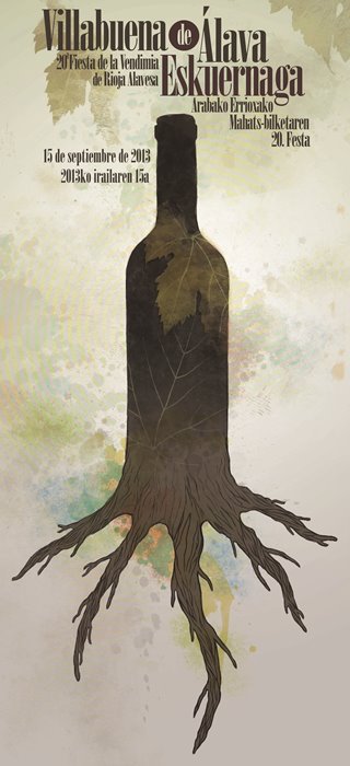 La Cuadrilla de Laguardia-Rioja Alavesa ha desvelado hoy el cartel de la Fiesta de la Vendimia de Rioja Alavesa, que celebra su XX edición el próximo 15 de Septiembre, en la localidad de Villabuena de Álava. 'Las Raíces del Vino', obra de Óscar Herreros, se ha impuesto entre una treintena de trabajos presentados a concurso y desde hoy es la imagen de la Fiesta de la Vendimia.