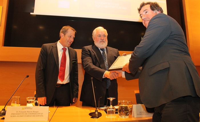 Fernando Prieto, en representación de Cuatro Rayas, recoge el premio de manos del Ministro de Agricultura, Miguel Arias Cañete, en un acto que ha tenido lugar en el Salón de Actos del Ministerio de Agricultura, Plaza San Juan de la Cruz s/n.