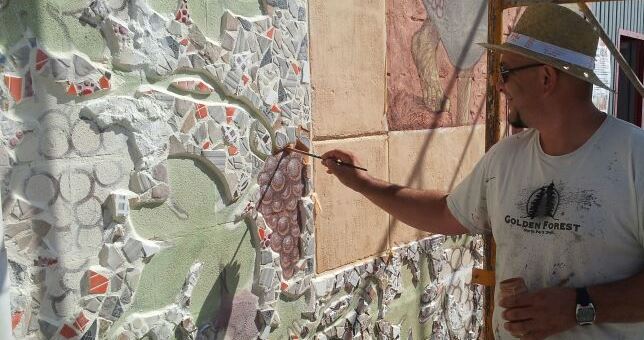 El mosaico también está siendo elaborado por los alumnos de entre 11 y 50 años que han participado en el curso de muralismo que ha impartido Toni Espinar en el Celler La Muntanya.