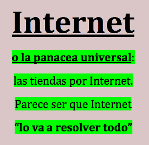 Internet o la panacea universal: las tiendas por Internet. Parece ser que Internet “lo va resolver todo”desde los estudios de nuestros hijos y nietos que si no están colgados todo el día de la red no son felices, hasta la economía del país y el hambre del mundo. Ahora si no estás en Internet no eres nadie. Internet ya lo globalizó todo, ahora no hace falta comprarse la última moda de calzoncillos en la tienda más cara y más de moda. Te los mandan de China a tu domicilio en un par de días y tres veces baratos. Y luego esos mismos orientales te rompen los mercados e imponen los precios a las borreguiles economías de la CEE. Ya solo me falta por oir que nos están vendiendo las mejores cosechas de las DO españolas a mejor precio que en bodega. ¡Al tiempo!