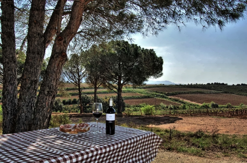 Almuerzo en la viña Finca Malaveïna: pan con tomate y embutido + degustación del vino Finca Malaveïna.
