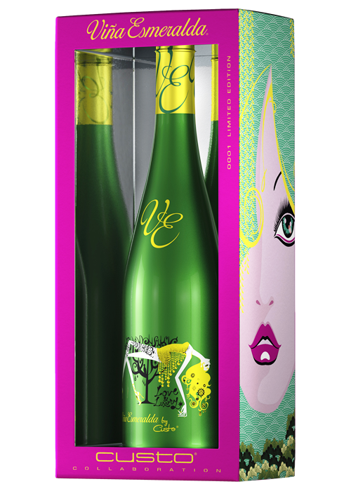 Su Edición Limitada de Viña Esmeralda, rinde homenaje a la diversión, al Mediterráneo, y a la sensualidad, y con tan alegres premisas, dibujó una ilustración que muestra a una mujer tendida sobre una viña, en una actitud relajada y epicúrea, ataviada con uno de los sofisticados looks de la marca en tonos dorados, y acompañada por uno de sus lemas: Love&Luxury. Esta ilustración, a modo de etiqueta, lanza destellos de amarillo dorado sobre una botella que Custo ha querido teñir de intenso y refrescante verde metalizado. Una propuesta cromática que encaja por igual con la identidad de Viña Esmeralda y el colorido concepto de la moda según Custo Dalmau.