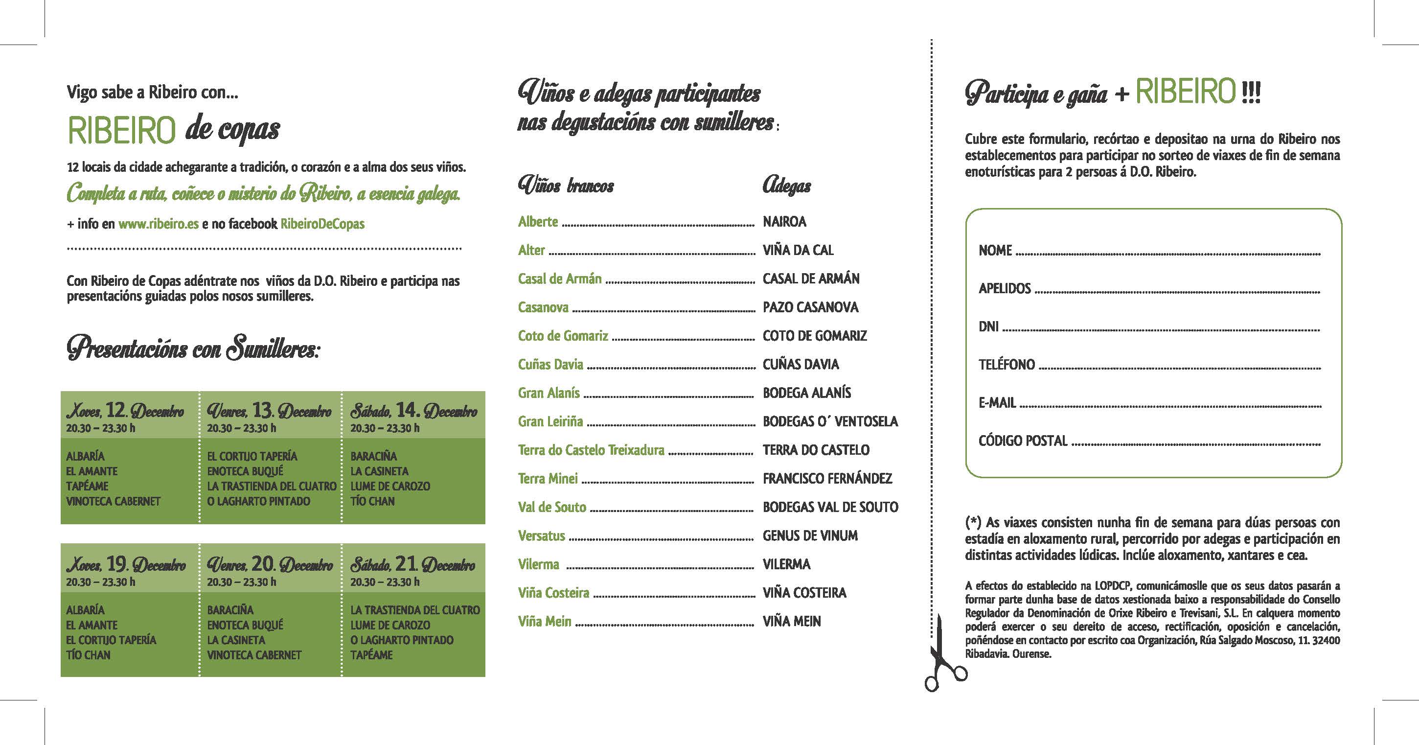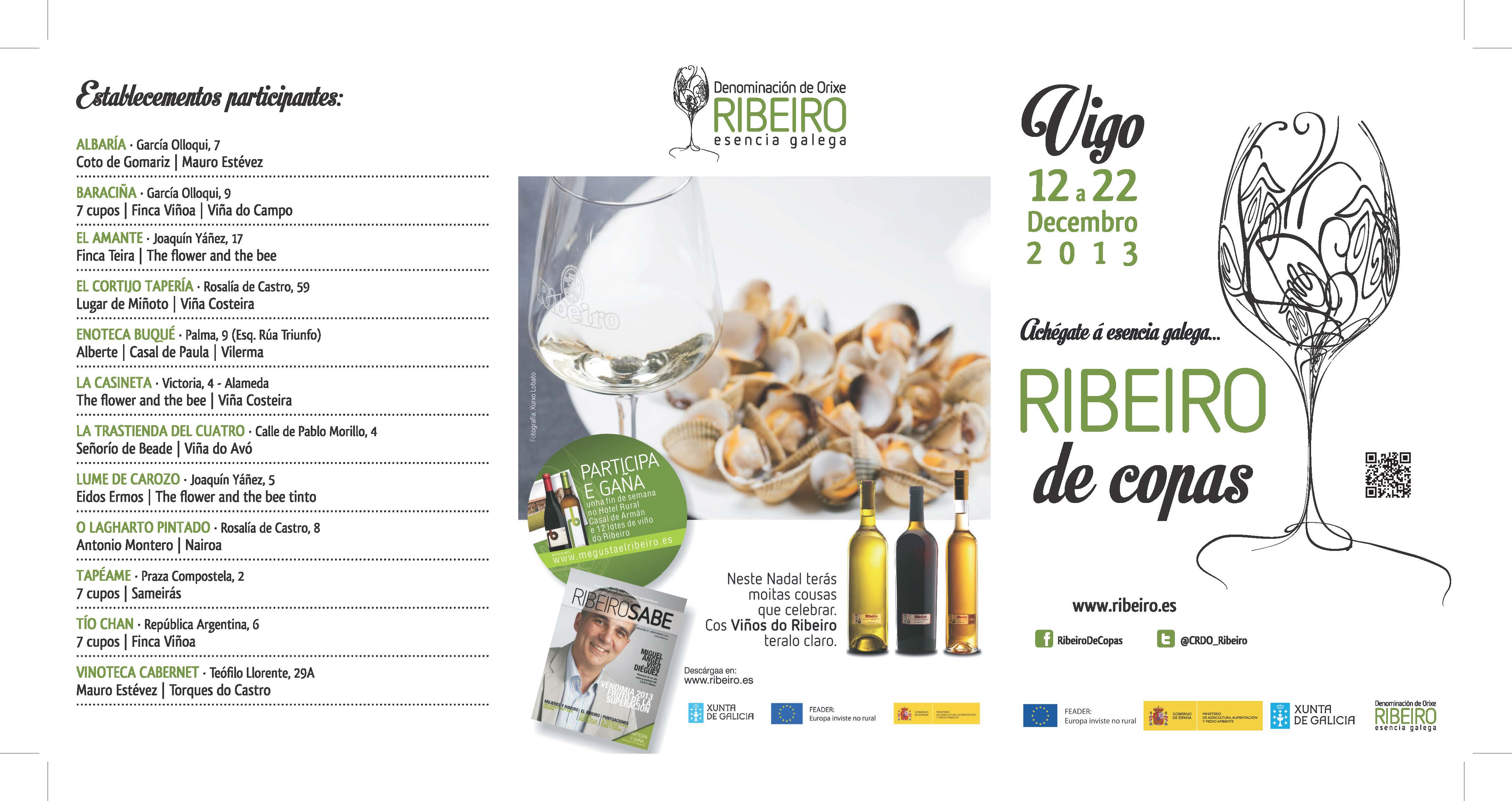 El listado de establecimientos vigueses escenario del Ribeiro de Copas 2013 lo forman: Albaría, Él Amante, Tapéame, Vinoteca Cabernet, Él Cortijo Tapería, Lana Trastienda de él Cuatro, Fuego de Carozo, El Lagharto Pintado, Baraciña, Buqué Enoteca, Lana Casineta y Tío Suelo. En ellos, los consumidores pueden descubrir una amplia gama de vinos y elaboraciones de la Denominación.